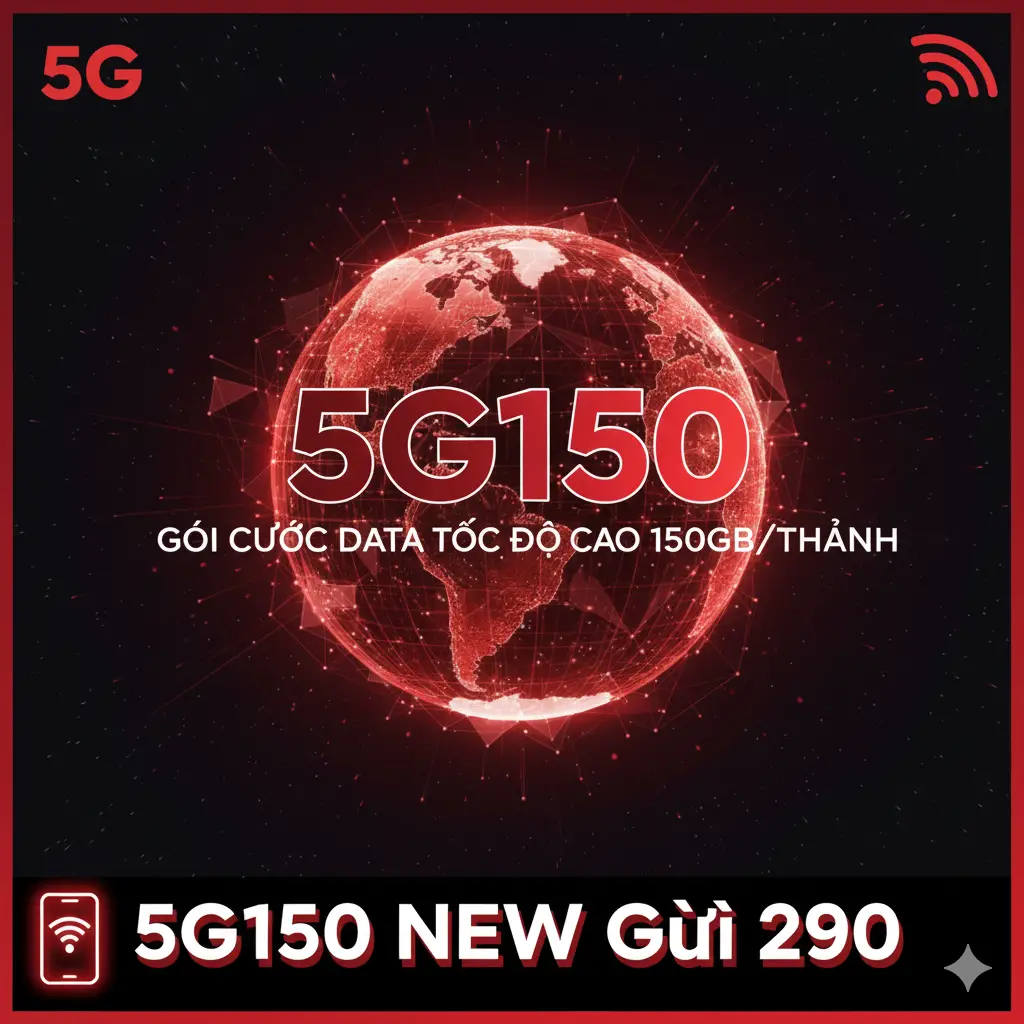 Gói cước 5G150 Viettel là lựa chọn lý tưởng cho người cần dung lượng lớn – tốc độ cao – giá rẻ. Chỉ cần soạn 5G150 NEW gửi 290, bạn sẽ có ngay 90GB/tháng để truy cập Internet mượt mà suốt 30 ngày.